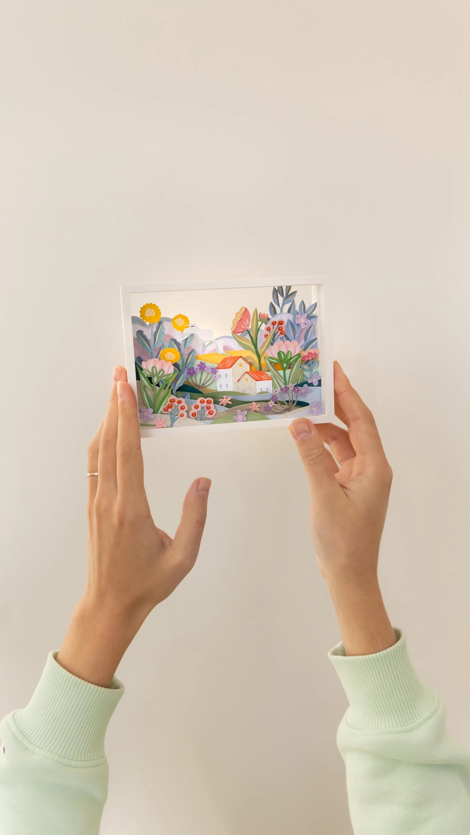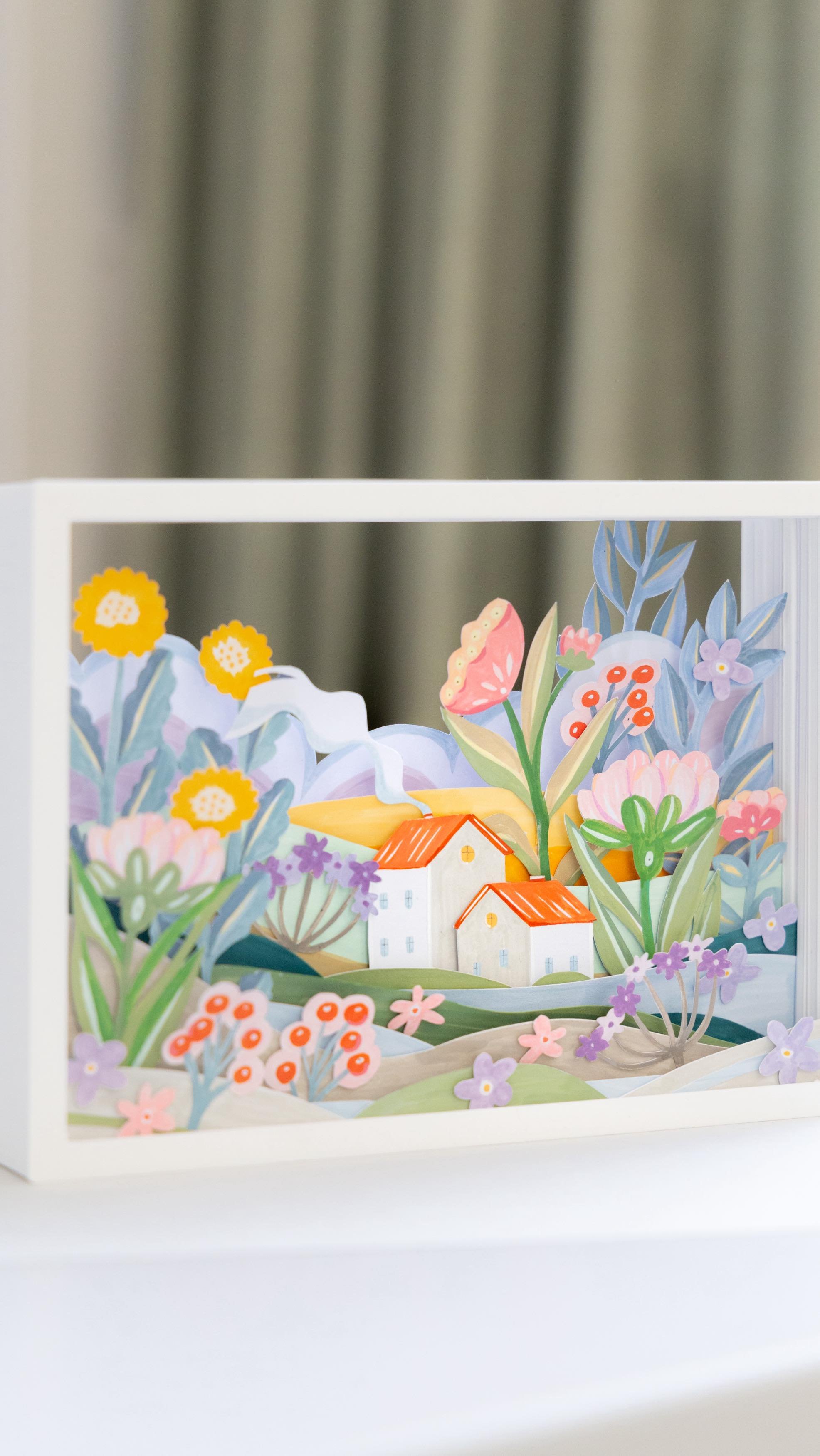 I create layered shadowboxes and paper art scenes inspired by nature
